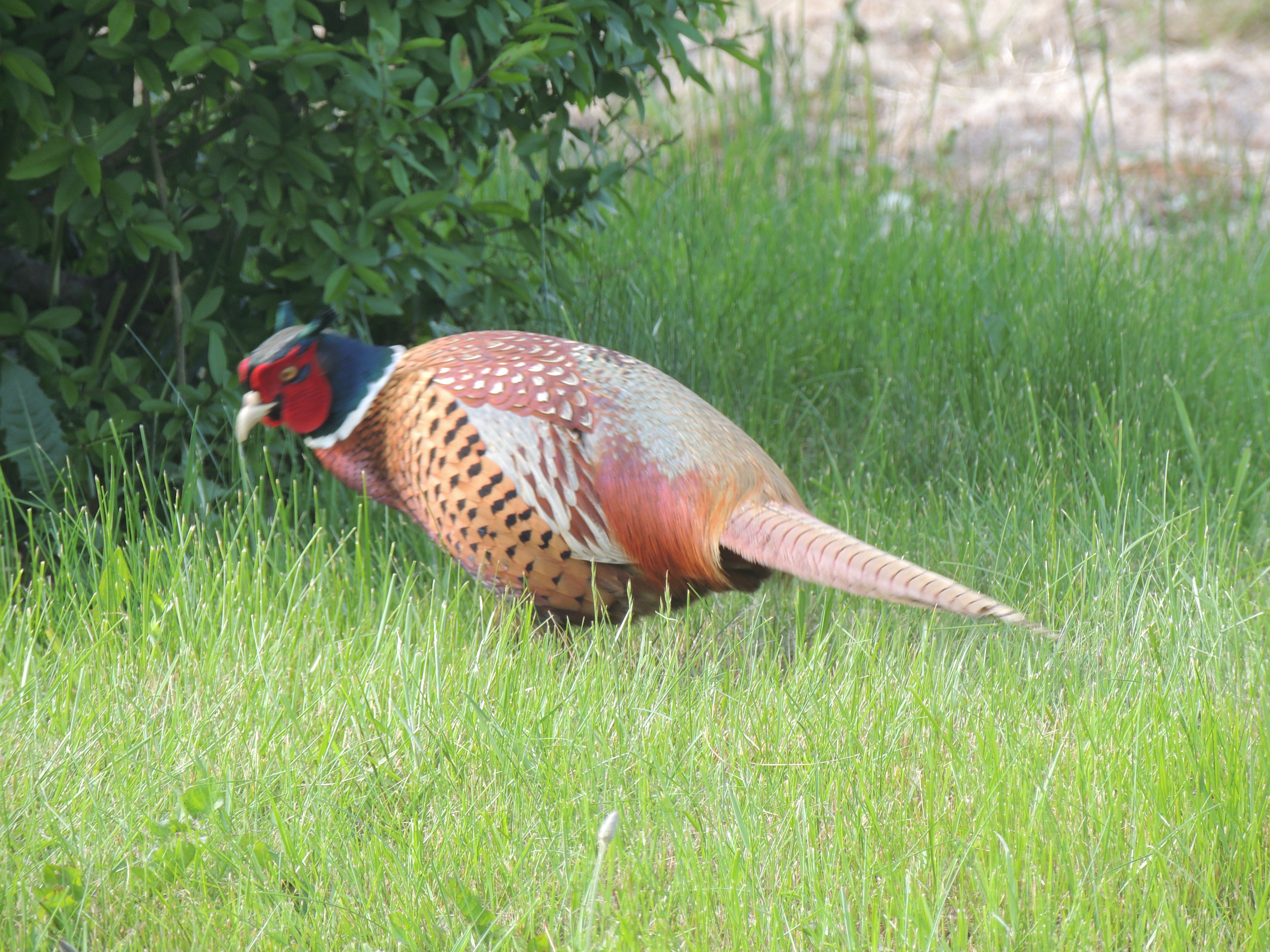 It’s always interesting here at my dad’s. One never knows what will appear in the brook or on the lawn, at or near the feeders, or just passing through. Besides deer and cock pheasants and their hens we have watched ducks, a fox, raccoons, hawks, many other birds including cardinals, a kingfisher, and grey herons.